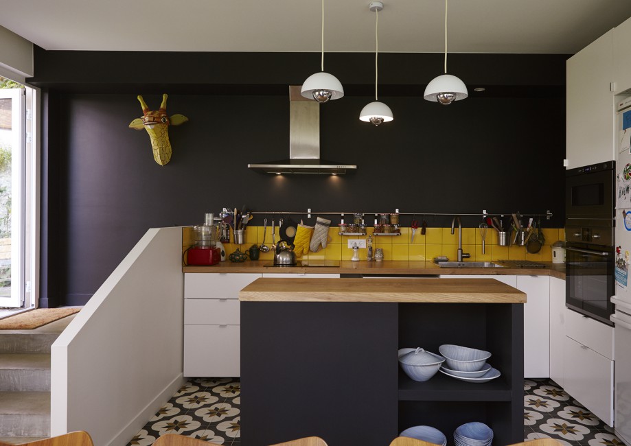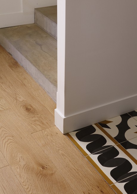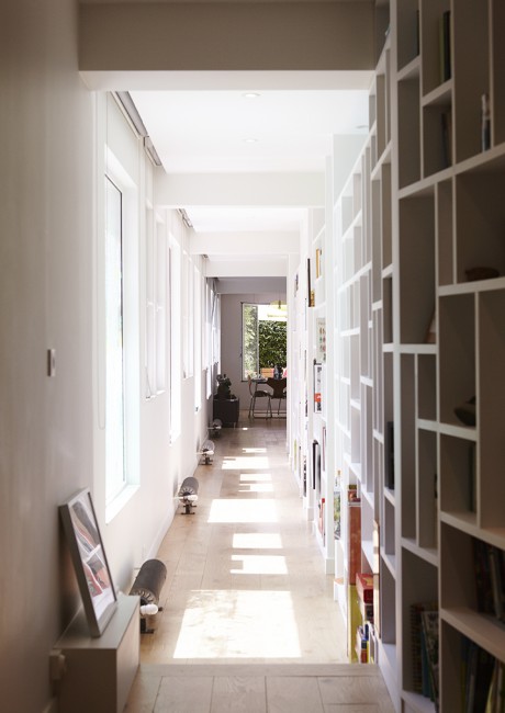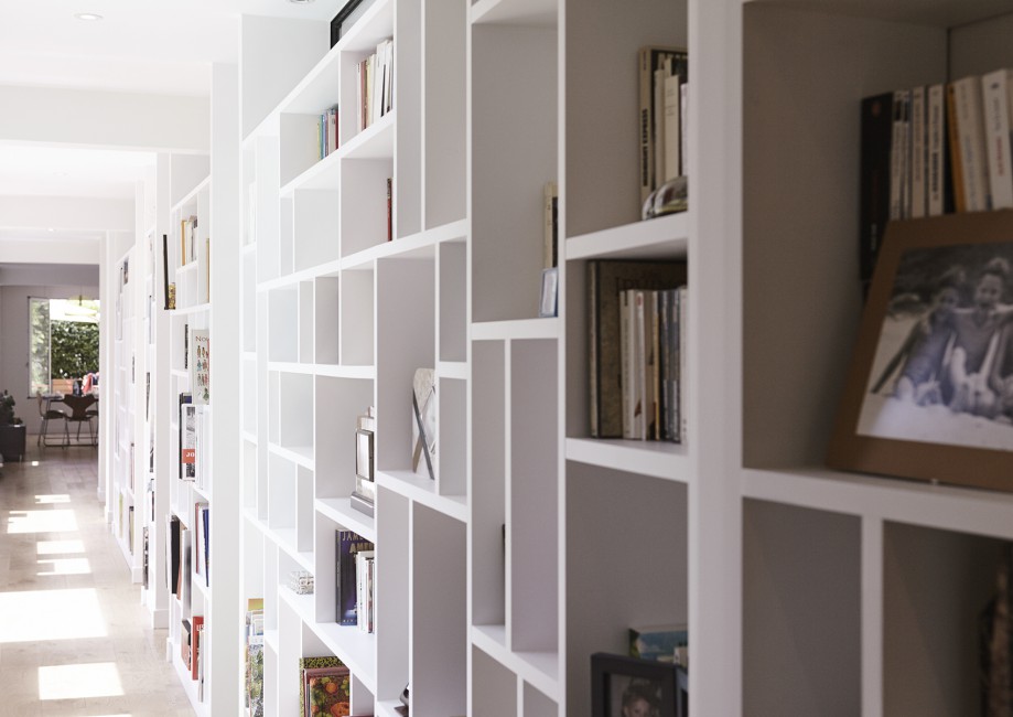 Le parti pris : tout l’appartement est distribué par un couloir qui sert de filtre, protège les espaces privatifs du vis à vis tout en laissant pénétrer la lumière du jardin. Les modules géométriques qui composent la bibliothèque instaurent un dialogue ludique avec les ouvertures régulières de la façade existante, en créant des jeux de lumière et d’ombres.