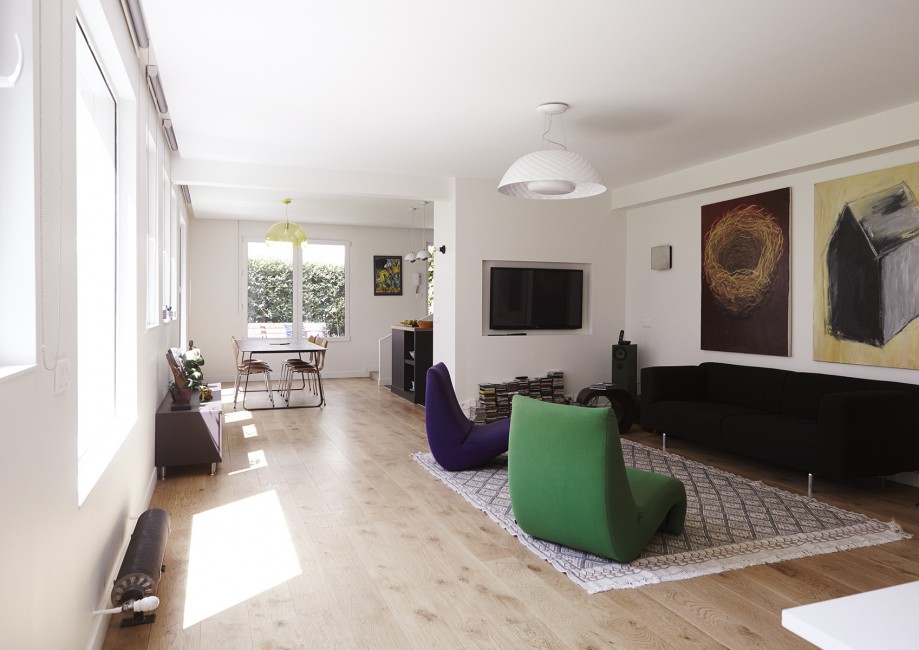 Nous sommes dans le XVIIIe arrondissement. La rénovation de cet ancien local commercial long et étroit (30mx5m) en appartement familial, devait dépasser une double contrainte : d’un coté la présence d’un long mur pignon et de l’autre l’ouverture complète sur un jardin en cœur d’îlot avec un fort vis-à-vis.
