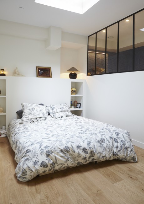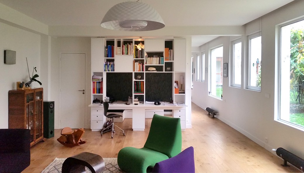 La création de velux en toiture garantit un apport maximal de lumière et une ventilation naturelle dans les chambres. Au bout de cette promenade s’ouvre un grand séjour, pensé pour être un lieu de détente (prévu pour accueillir une table de ping-pong) et de travail : le bureau sur mesure, prolongement de la bibliothèque, isole cet espace sans le fermer. Sa configuration permet aux deux propriétaires de travailler ensemble en gardant chacun son propre espace. Les espaces distincts et complémentaires s’entremêlent pour créer une spatialité généreuse.