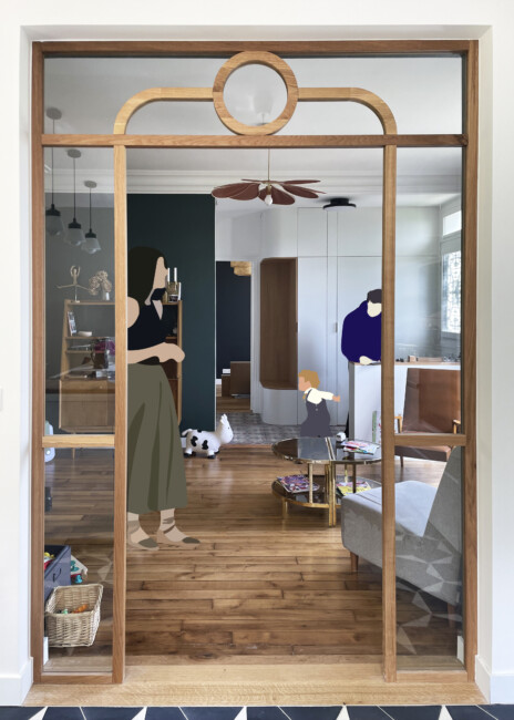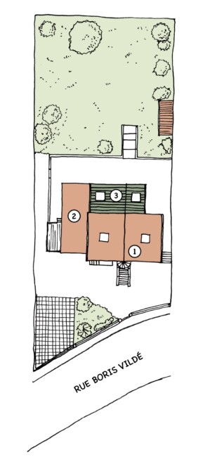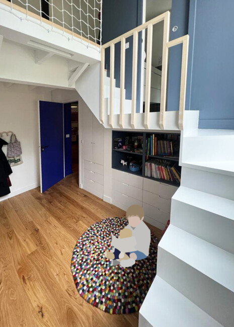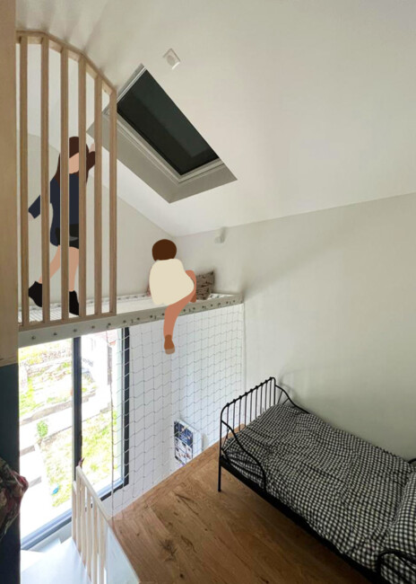 L'accès à l'extension/surélévation se fait par le premier étage par la salle de jeux. Elle est réalisée en structure bois avec un bardage zinc. Le choix d'une implantation côté jardin permet d'être invisible depuis la rue et préserver le caractère historique de la maison en pierre de taille d'un côté et permet également de profiter d'une vue dégagée sur le jardin pour plus d'intimité. "L'extension ludique" (3), d'une surface de 25 m2, est pensée comme un parcours de jeux : on accède dans un espace bureau avec des rangements sur mesure nichés sous les escaliers. Un demi-niveau cache une salle de bain partagée entre les deux chambres avant d'accéder à la mezzanine où on retrouve l'espace nuit. Un dernier niveau sur la salle d'eau est utilisé comme un espace communiquant entre les deux chambres et aménagé avec des filets pour le jeu et le repos. Ce parcours est guidé par des couleurs qui servent de transition aux différents espaces.