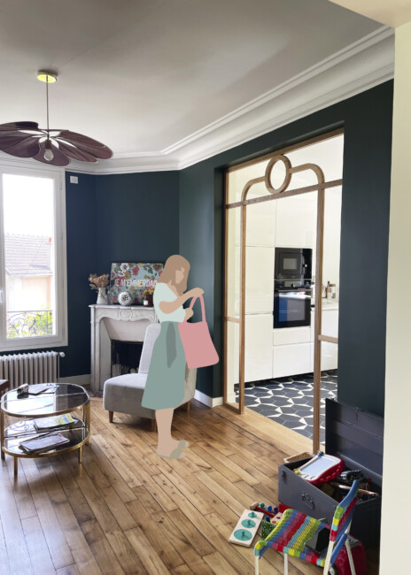 À l'origine, une maison des années 1900 (1) et deux extensions : l'une des années 70 (2) et l'autre des années 90. La cuisine est petite et éloignée des espaces de vie. La maison manque de rangements et les pièces humides sont vétustes. Le projet de rénovation prévoit de déplacer la cuisine dans l'une des extensions existantes pour la relier aux pièces de vie et au jardin. Le rez-de-chaussée est aménagé avec une entrée lumineuse équipée de rangement sur mesure qui dissimule l'aménagement des toilettes. Le rez-de-chaussée devient ici une grande pièce de vie. Par le traitement du sol, le choix des couleurs et la présence d'une verrière sur mesure en chêne, la transition entre les espaces est fluide.