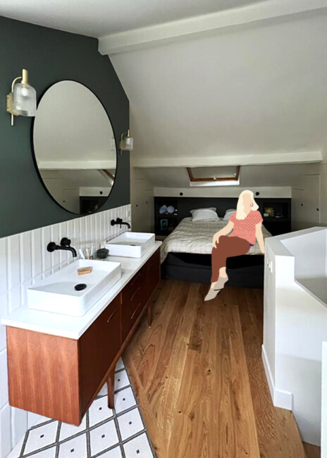 Au premier étage, on retrouve une mini suite avec sa salle de bain pour le plus grand des enfants, une salle de bain commune et une salle de jeux aux couleurs vives. Au dernier étage, une grande suite parentale avec des rangements sur mesure et une salle de bain est aménagée. La baignoire est disposée sous le velux pour pouvoir profiter de la vue du ciel pendant le temps de relaxation.