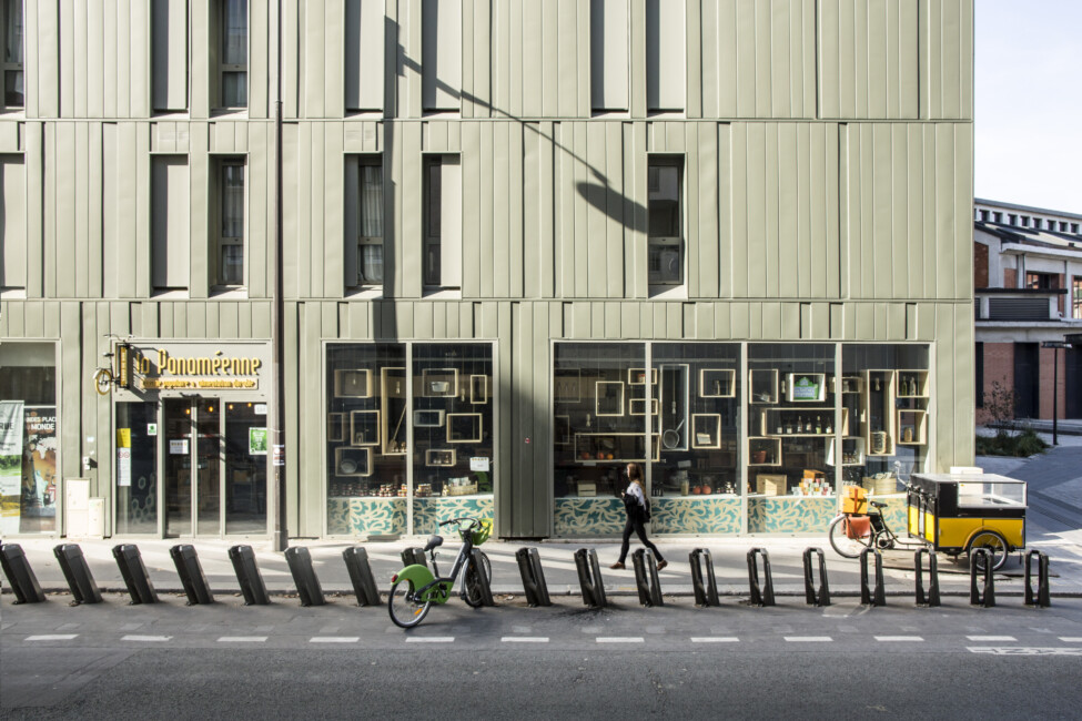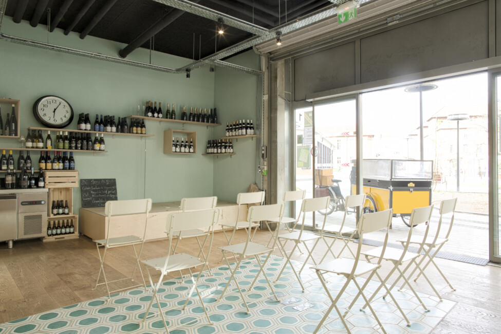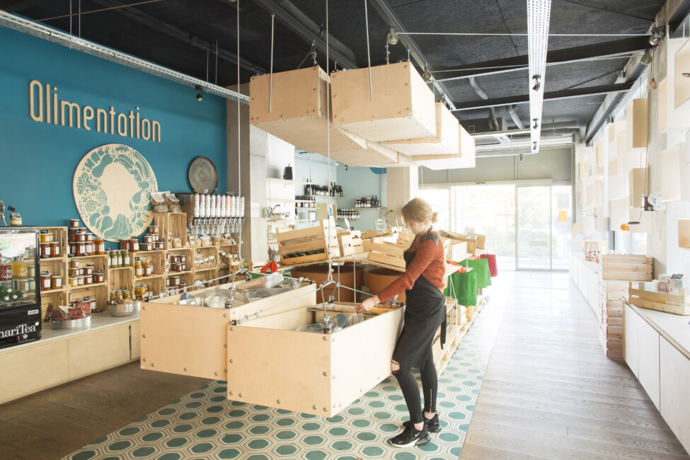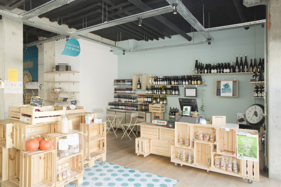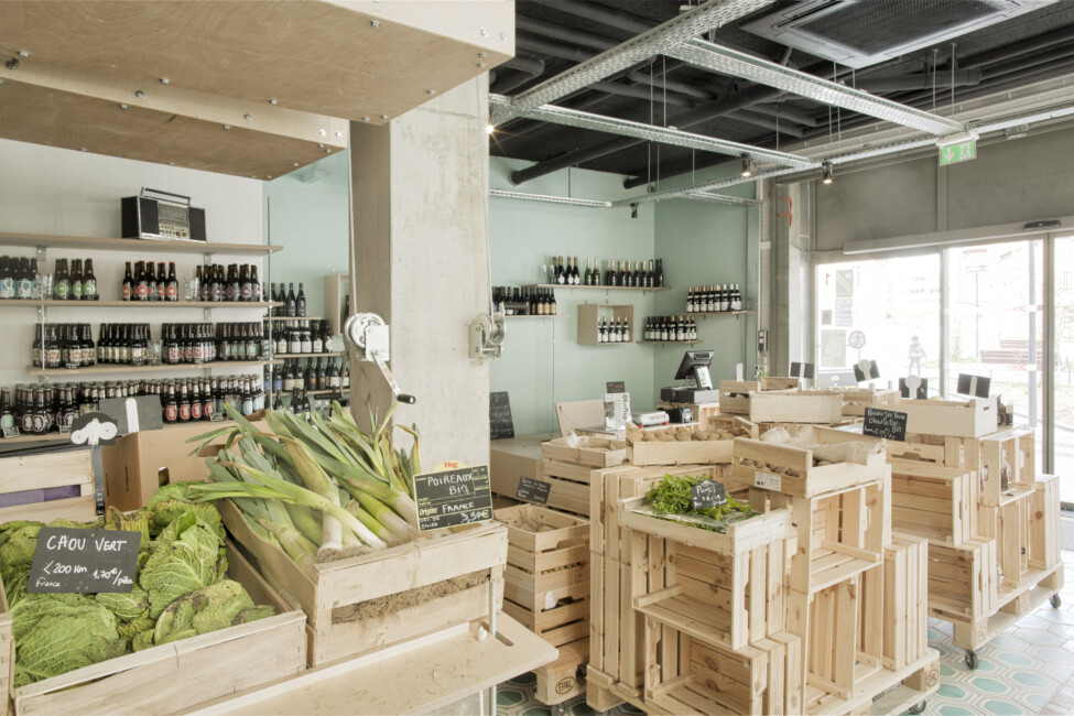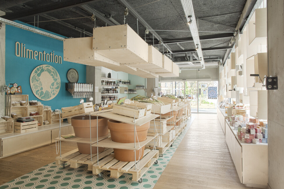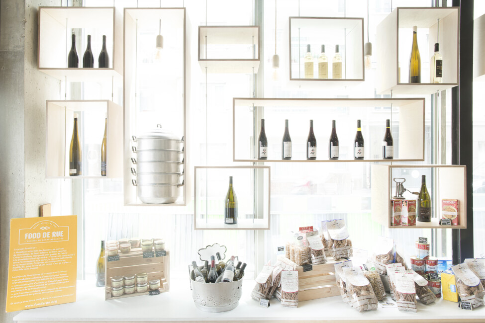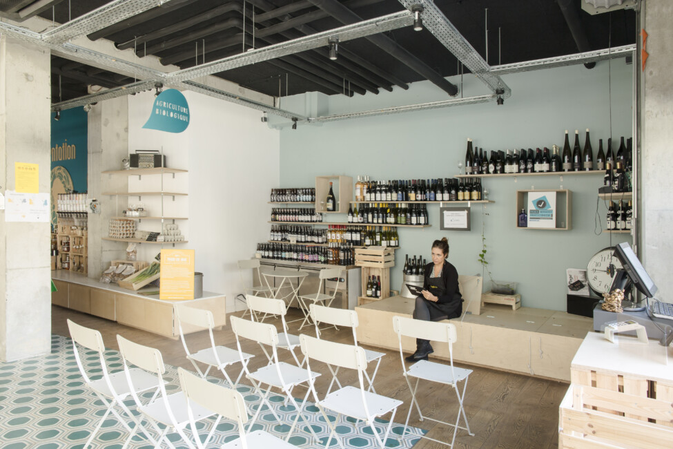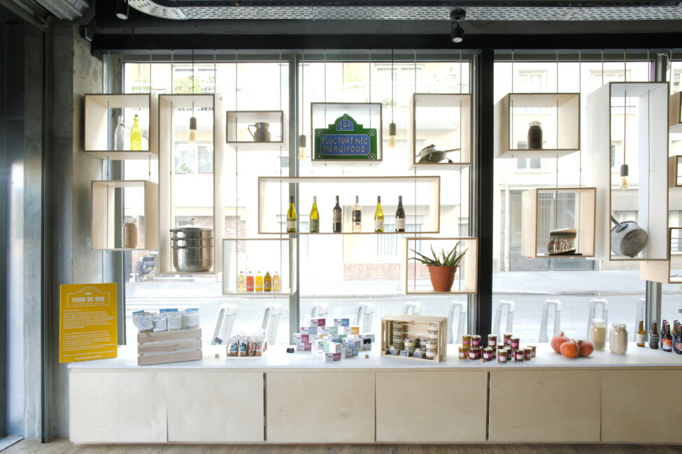 L'enjeux est de donner une visibilité à ce nouveau lieu de vie du quartier sur la place Alice Guy. Dans les vitrines, des boites présentoirs sont suspendues à des câbles verticaux, et flottent dans la hauteur des baies donnant sur la rue Didot. L'exposition des produits en vente est ainsi transformable rapidement et de façon ludique. La composition laisse passer généreusement les vues et la lumière de l'intérieur vers l'extérieur, et inversement.