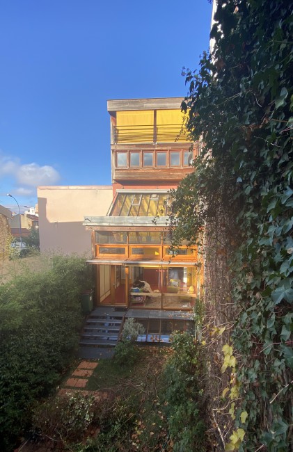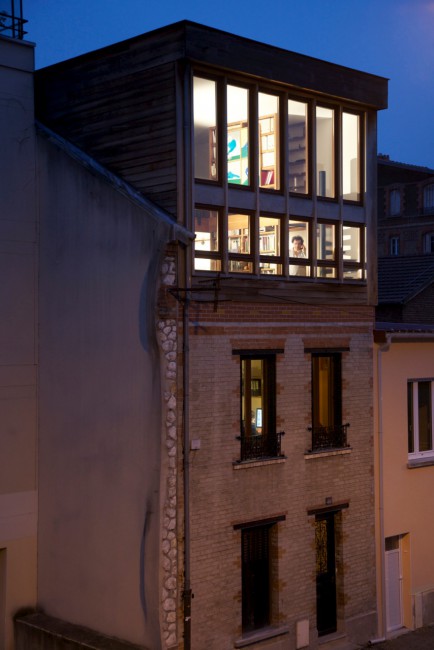 - En 2002, par l’ajout de deux niveaux en remplacement du comble afin de réaliser un atelier et un mezzanine. La surélévation s’est faite à partir de la consolidation des maçonneries avec un chaînage périmétrique sur lequel ont été posé des caissons en bois sur les deux pignons mitoyens. Un solivage en lamellé-collé franchit le vide entre les deux refends.