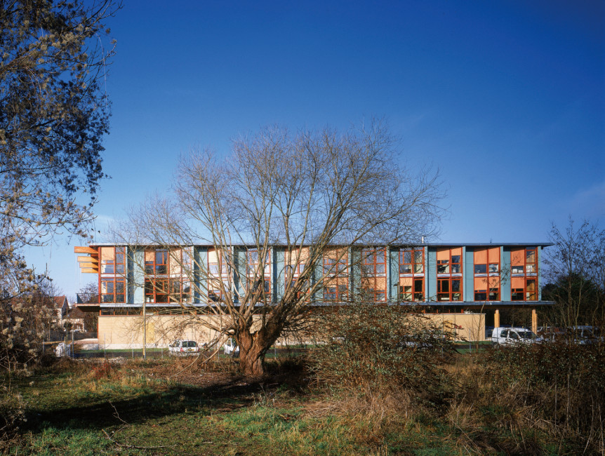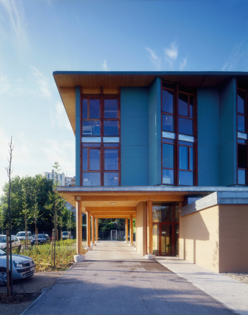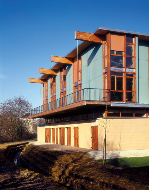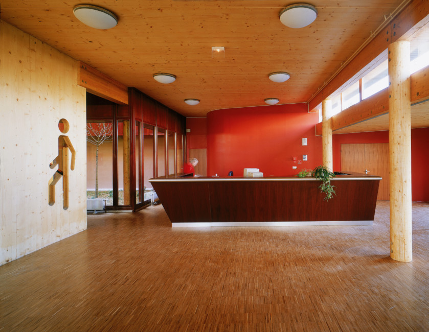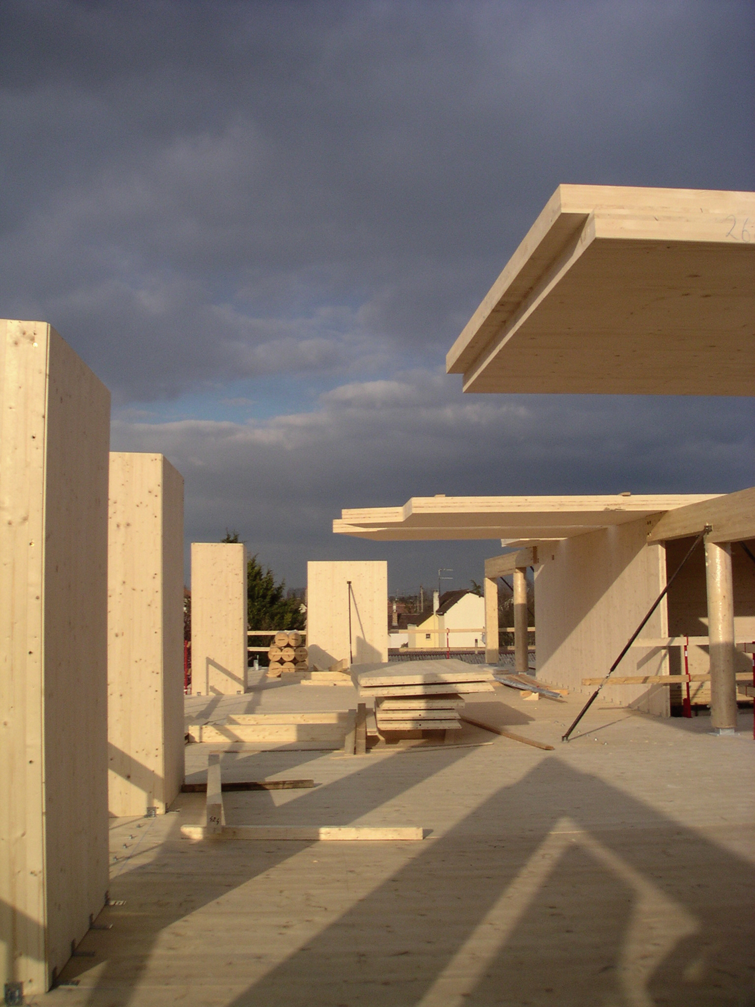 L’écriture architecturale est composée autour d’un travail du bois. Le projet est conçu exclusivement de panneaux en bois massif compressé et collé. Les planchers bois supportent une chape de mortier léger pour une bonne acoustique. Le toit, les planchers et les murs porteurs sont en épicéa, les menuiseries sont en moabi.