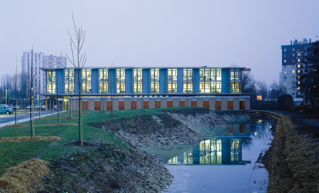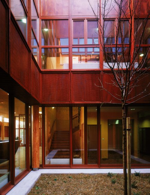 Telles les grandes propriétés rurales, le corps de bâtiment est située dans la perspective d’une allée bordée d’arbres. L’alignement de ces arbres trace un axe qui oriente le regard vers lʼespace d’entrée et de réception du public. Un jardin intérieur met en perspective les différents niveaux du bâtiment.