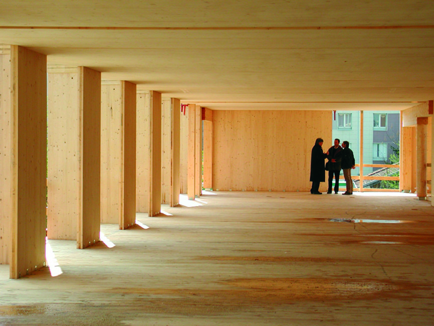 Les pièces de construction de 295 cm par 1600 cm sont assemblées et découpées en usine. Le montage, planchers, murs et toiture, a été réalisé en 21 jours par 6 charpentiers. Il a nécessité 350m³ de bois, 700 tonnes de C02 sont capturés.