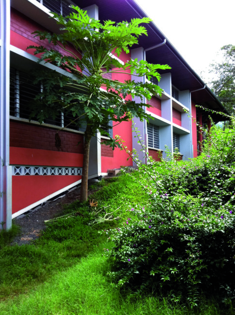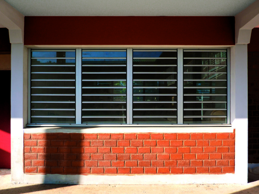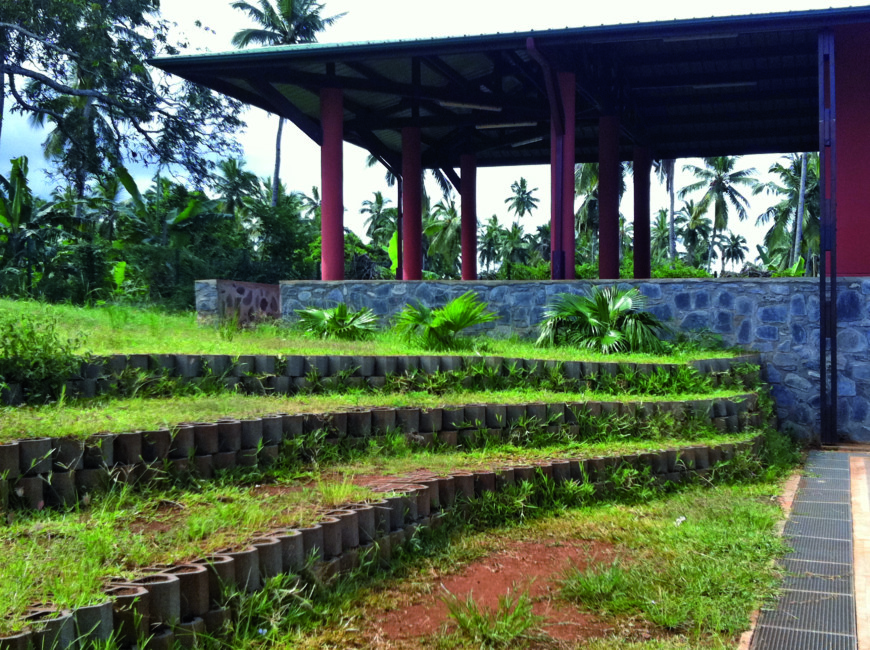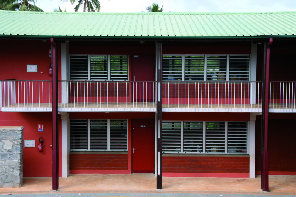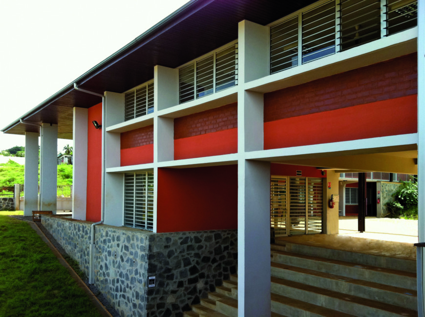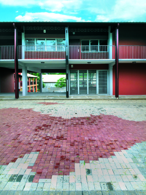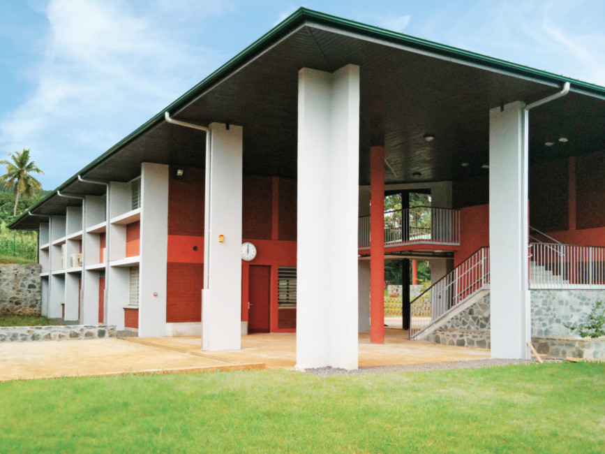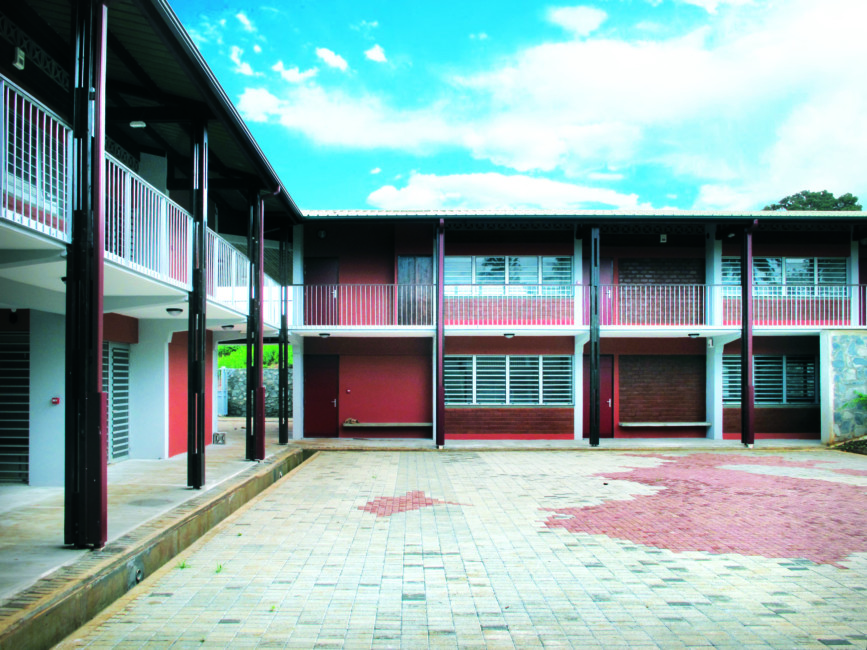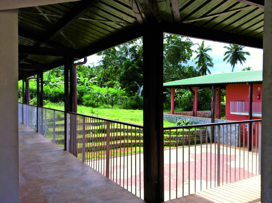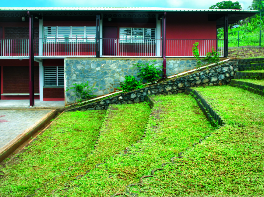 La construction est mixte : blocs de terre comprimée (BTC) et béton armé. La cour est revêtue de pavés de deux couleurs qui représentent la carte géographique de Mayotte.